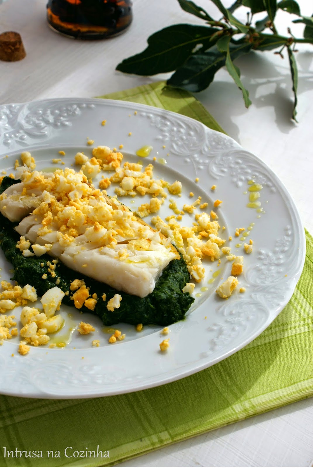 postas de pescada em água temperada de sal, e com o dente de alho e a folha de